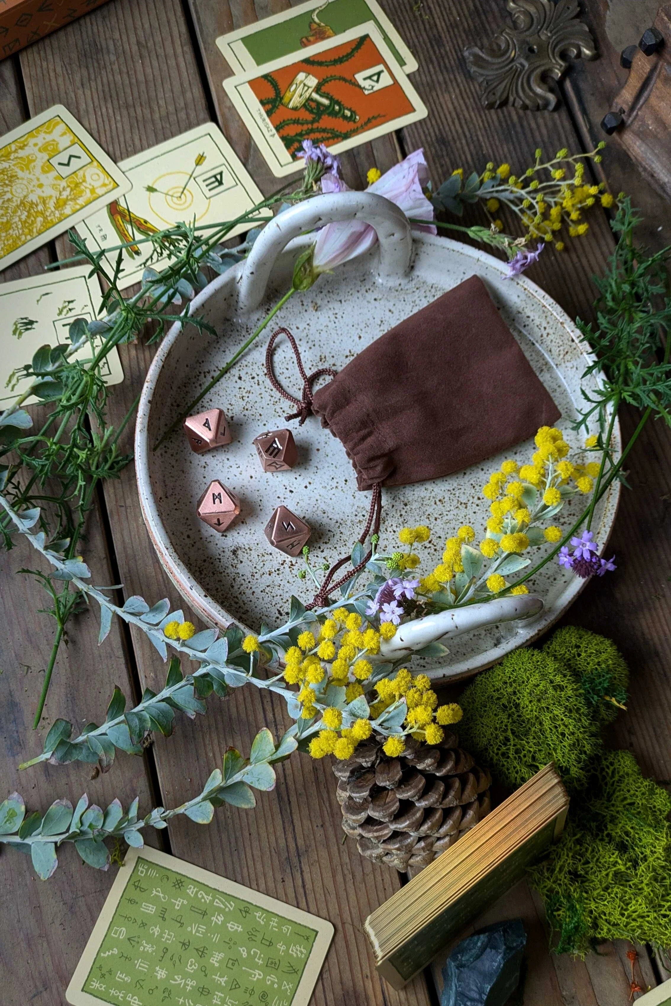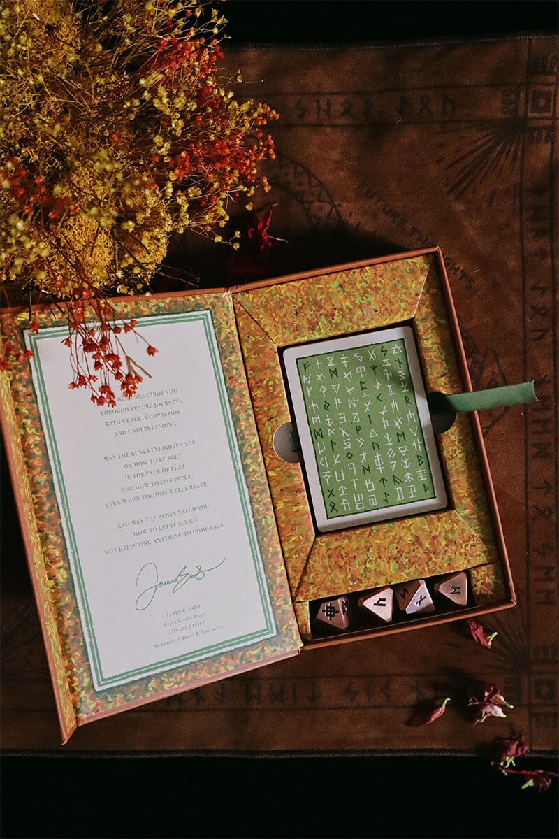 Esta baraja es mi interpretación de las runas del Futhark antiguo, un antiguo sistema nórdico de adivinación que existe desde hace milenios. Normalmente, las runas se encuentran en forma de piedras, dados, talismanes u otros objetos con grabados. Cuando empecé a aprender sobre las runas, me resultaba difícil relacionar el símbolo nórdico con su significado. Para ayudarme a comprender mejor los significados que hay detrás de cada runa, creé esta baraja de cartas. Cada carta tiene un símbolo rúnico, el nombre tradicional y una imagen que engloba el significado detrás del símbolo. Lo que resulta útil de las runas del Futhark antiguo es que los significados son relativamente sencillos. Cada runa transmite un concepto o sentimiento que prevalecía hace miles de años y que sigue siendo relevante hoy en día. Los dados incluidos proporcionan una forma alternativa de sacar runas en una lectura. -James.
